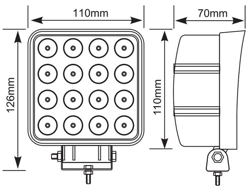 Der LED Arbeitsscheinwerfer mit einer Leistung von 48 Watt kommt überall dort zum Einsatz, wo maximale Leistung das Ziel ist. Der perfekte Scheinwerfer für Schlepper, wo das maximale an Licht rausgeholt werden soll! Trotz seiner hohen Leistung ist er klein in den Ausmessungen und kann somit problemlos angebaut werden. Seine 16 LEDs haben jeweils 3 Watt und somit eine Gesamtleistung von 48 Watt und ca. 3.200 Lumen. Die Leistung entspricht in etwa einem Halogen-Scheinwerfer mit 150 Watt! Zudem hat er einen tagesähnliches Licht, was bei langen Arbeiten bei Dunkelheit die Augen schont und den Fahrer nicht so schnell ermüden lässt. Der Abstrahlwinkel kann zwischen 30 und 60 Grad gewählt werden. Die Verarbeitungsqualität des Scheinwerfers ist sehr hochwertig, das Gehäuse ist aus Aluminium-Guss. Der Scheinwerfer ist zugelassen nach ECE R10.